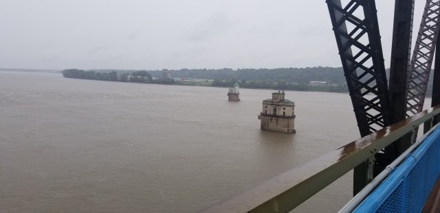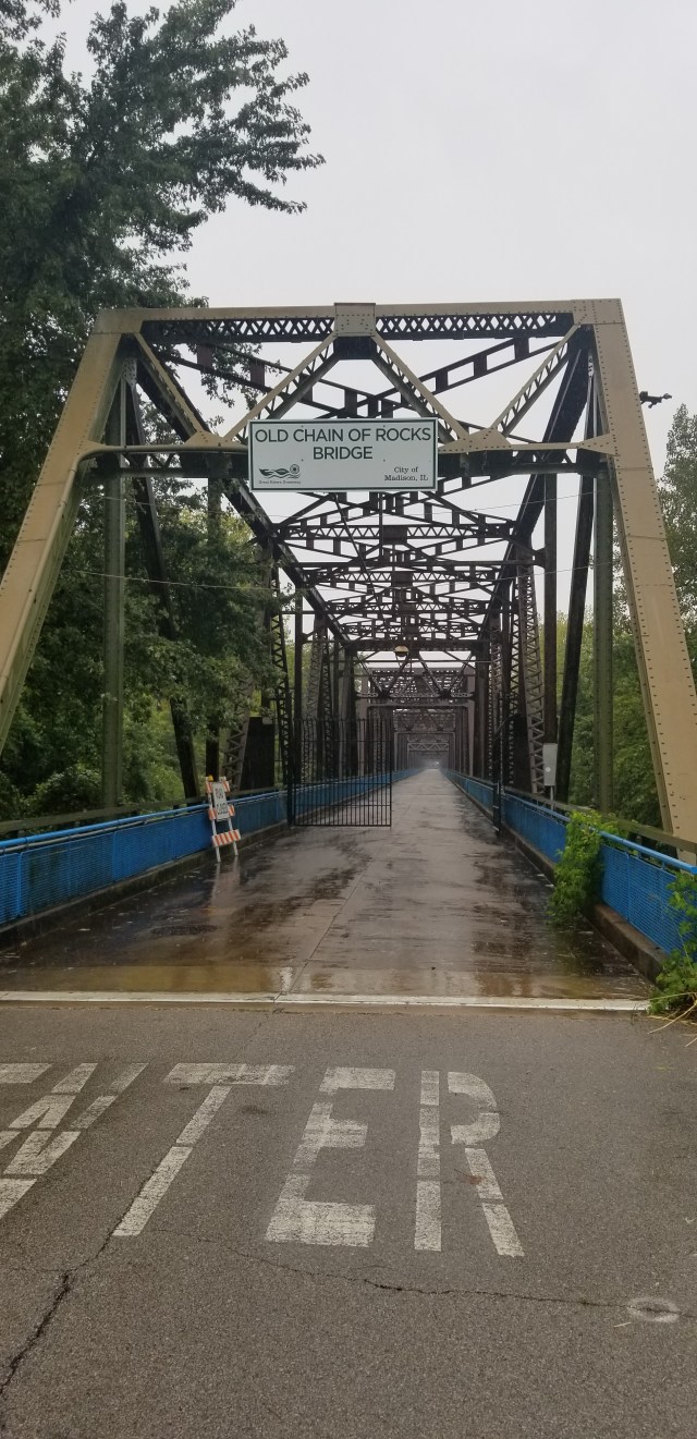 After spending the night in Indianapolis I reached the Mississippi early the next day. It was raining hard and I waiting to go to the Marina and put my boat in the water. I went to the Old Chain of Rocks bridge to scout out some rapids I will have to pass through on my first day on the river.