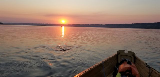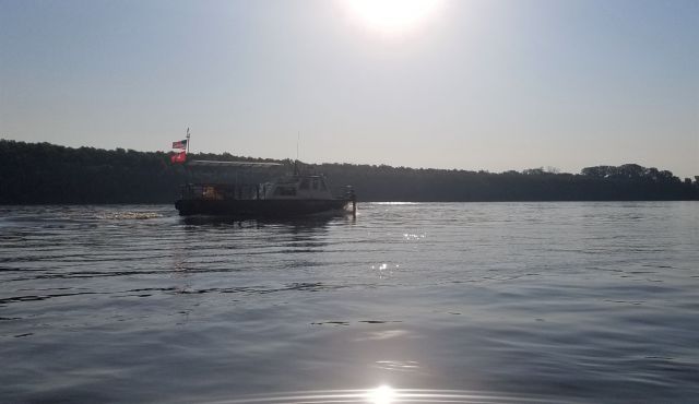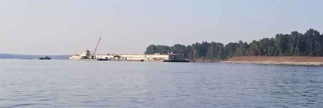 I overheard a group next to me saying a big fish is coming in. I asked and they told me in about a half an hour. That gave me time to go over and empty Little Joy and wipe her down to remove the small piles of sand and caked river mud that accumulated over the past few days. The steel deck of the dock radiates heat and I hurry to get the job done. I also cover the deck with a tarp to protect myself from being burned as I climb on and off it. The steel plates of the dock were so hot I honestly believe you could cook an egg on it.