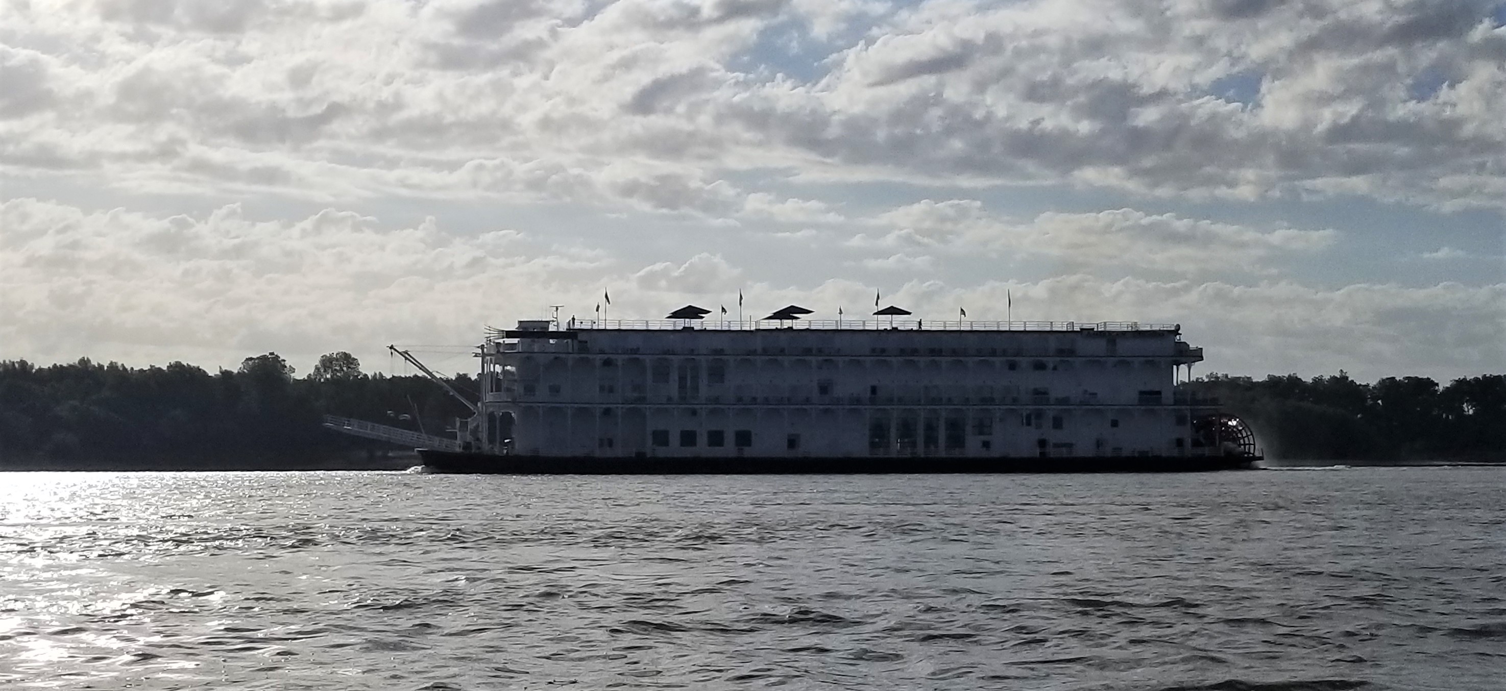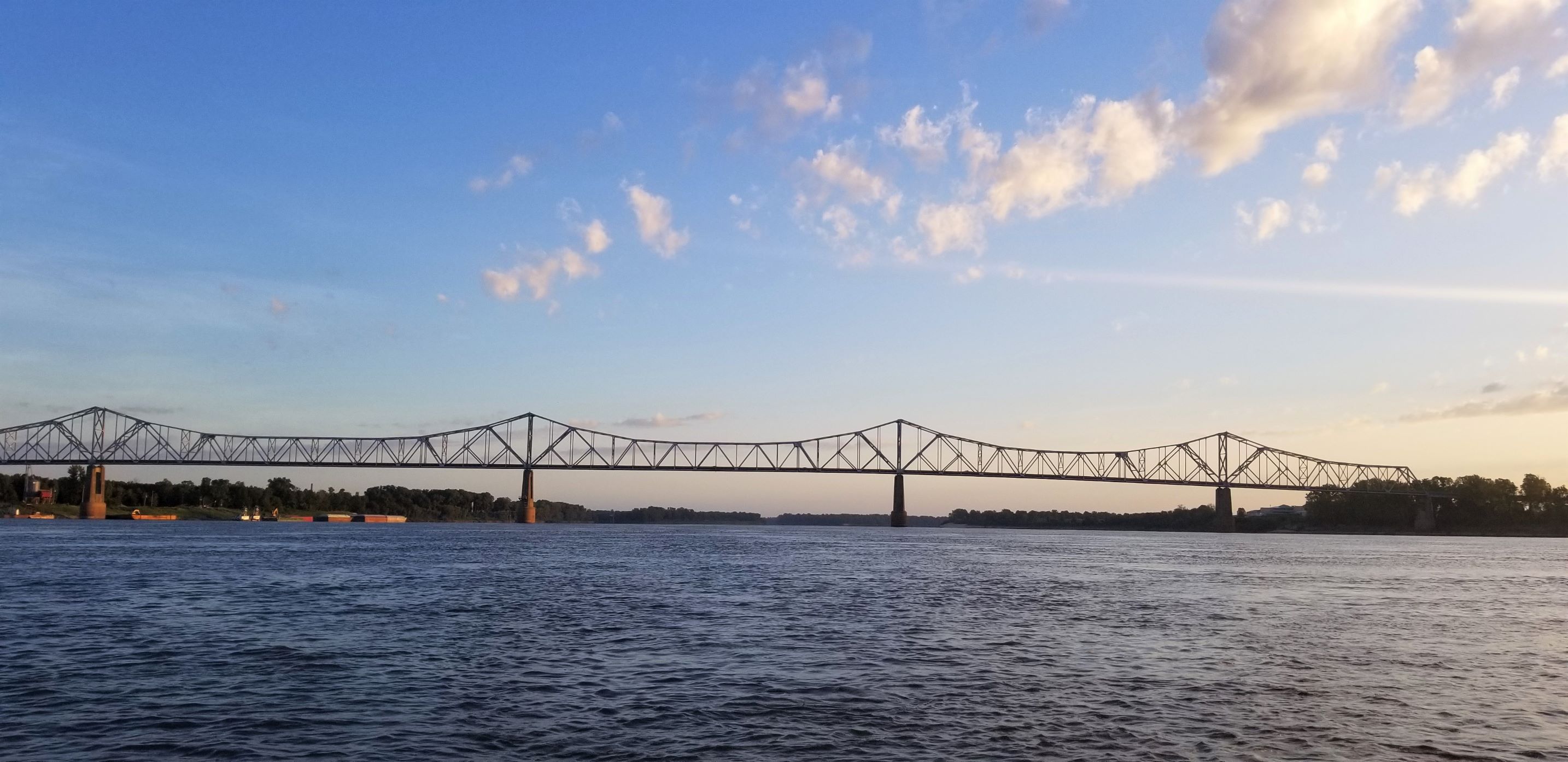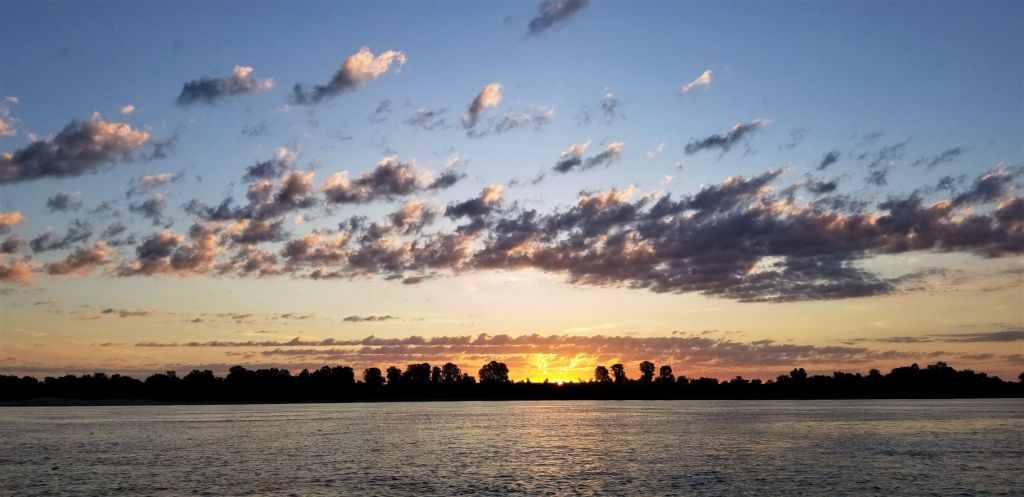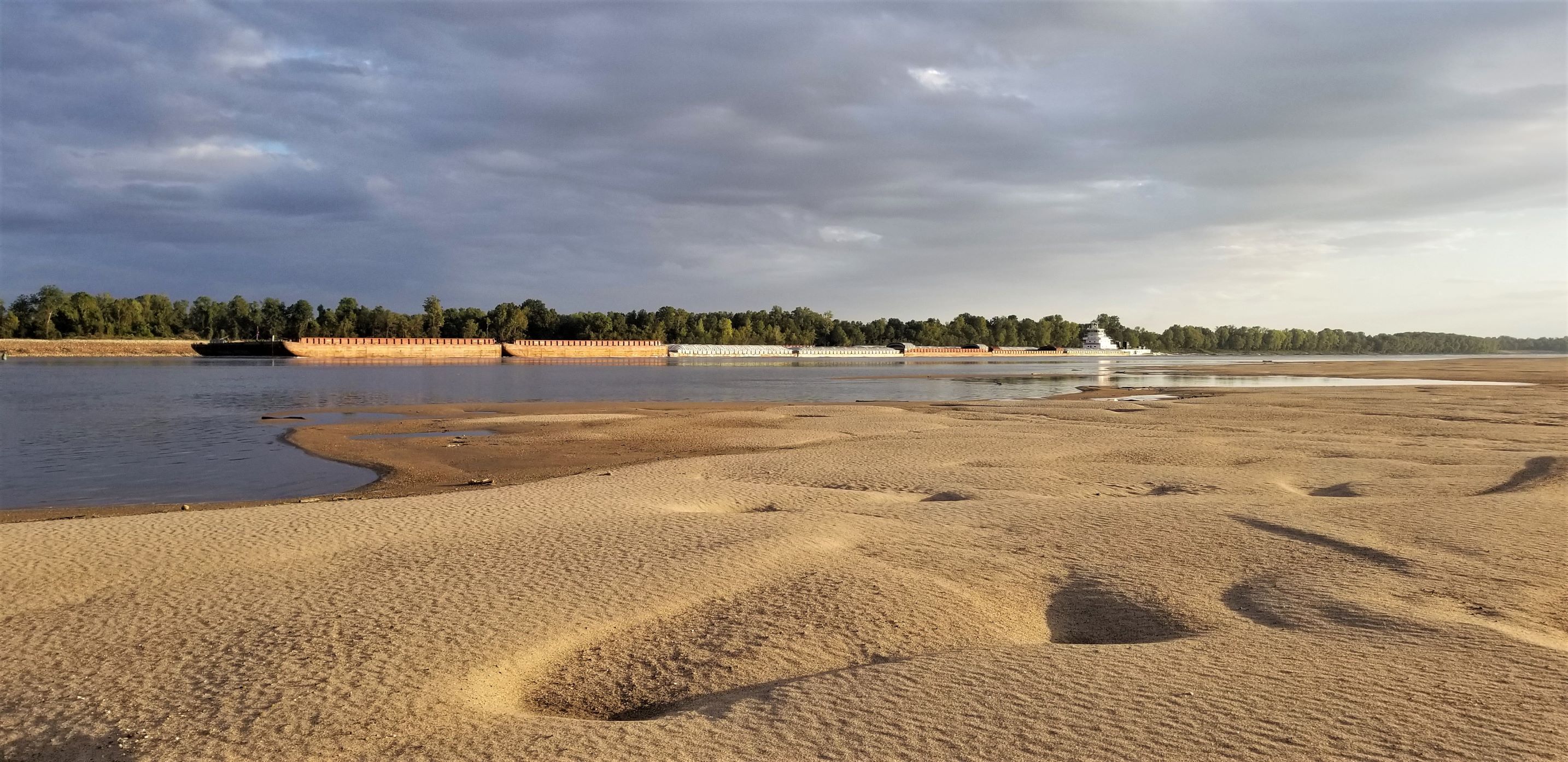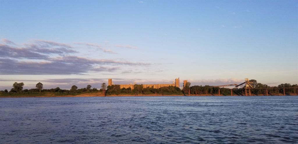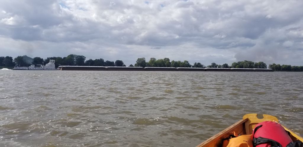 There is a barge stopped on the inside of a bend. The river picks up speed as it is funneled into the narrow stretch of the turn. Is it stopped? Maybe it’s moving. I beach on the same side as the barge and get out to try and get a better look. It’s definitely stopped. Back in the boat the current is so strong it’s hard to hold by the beach. I put on my PFD (personal flotation device) and cinch it tight. Screw it I’m going. Its fast and very choppy. As I enter the bend I move out to go around the parked barge. Another barge is coming up river I couldn’t see before and is now passing the parked one. Shit! I try to slow down against the current but I’m moving quick. I have no choice but to go. I go between the parked barge and the one headed up river staying right next to the parked one. I see its engines are running. Please don’t move for two more minutes. I wave my hat up at the bridge in hopes that they see me. The barge moving up river leaves a huge wake compounding the already churning water. I bounce around but keep my oars in the water. I think this is the fastest I have ever gone in ‘Little Joy’. Passing the towboat in the back, with its engines running, two deckhands stop what they are doing and give me a look of surprise and amusement. Two hundred yards past the boat I manage to stop on the small beach. I laugh and wave back up to the deckhands and they wave back. That was fun.