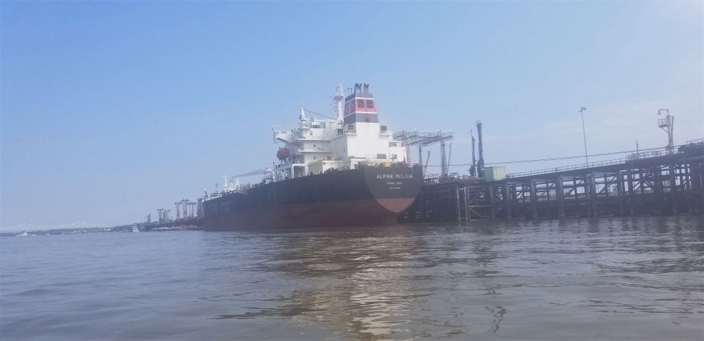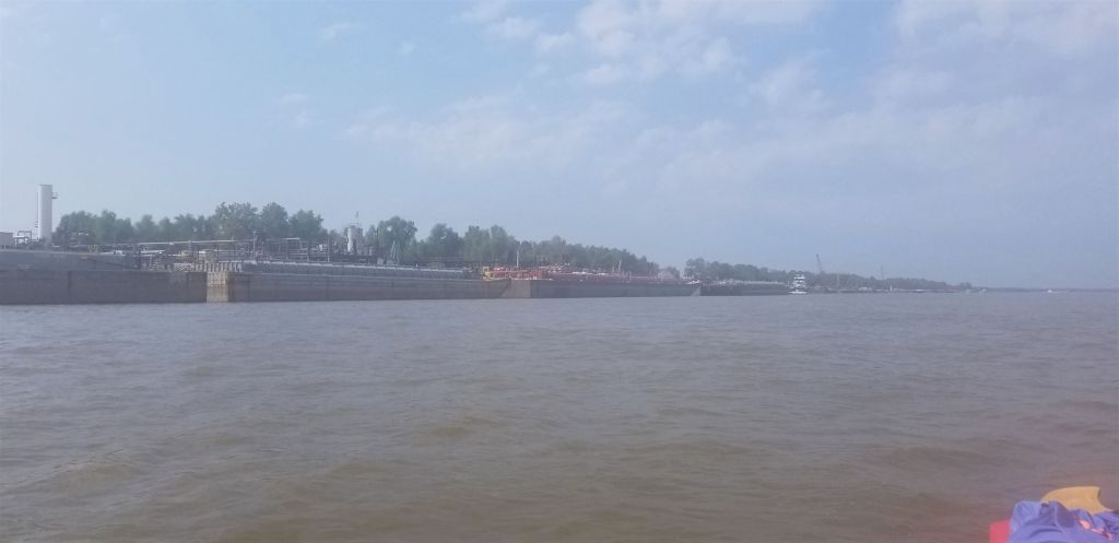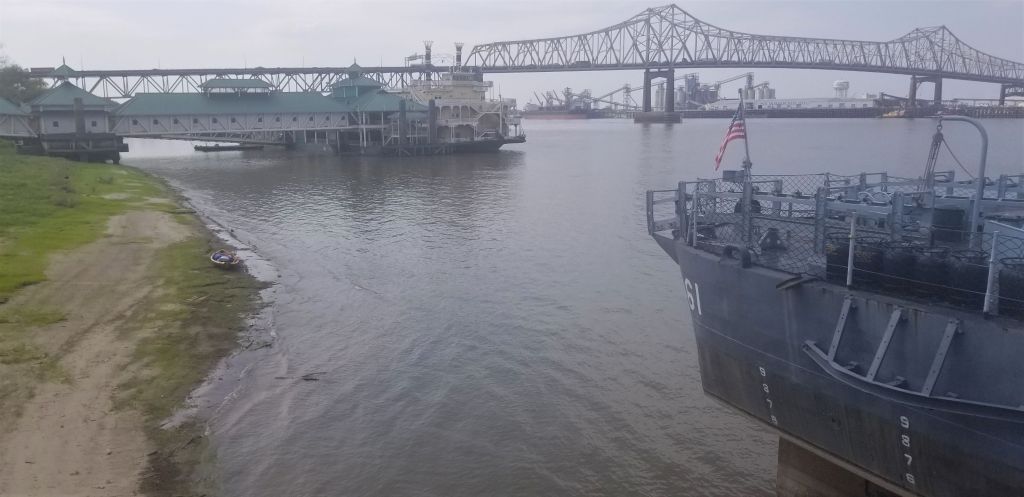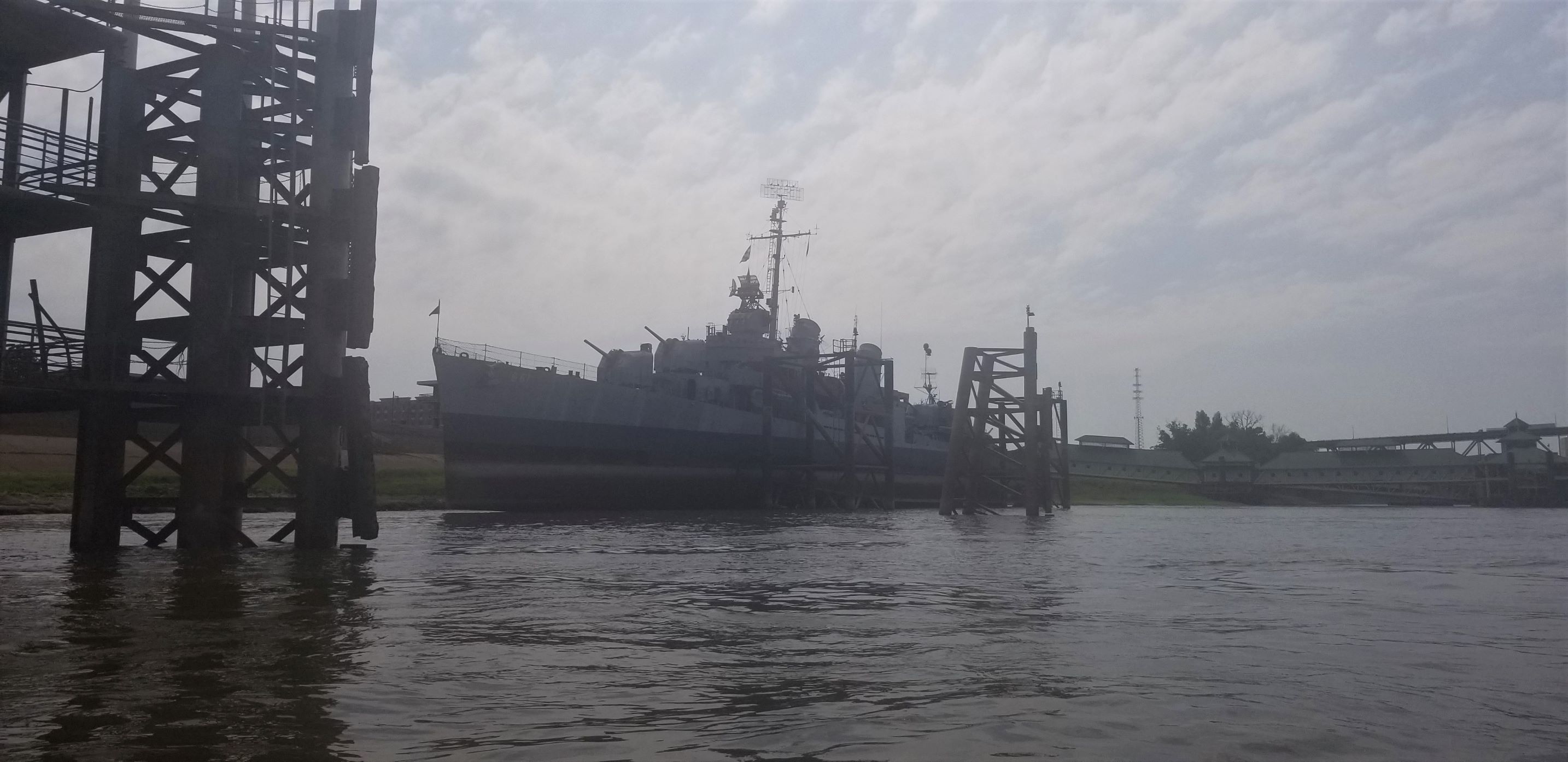 Passing under a bridge I see Baton Rouge on the other side of the river. I have to get over there now but a barge is coming up river. I stop and wait to cross 75 yards in front of a barge anchored in the river. A deckhand comes walking the length of the barge to the bow and says without shouting, “Could you move over to the side.” I quickly move over not realizing they were getting ready to move. Yikes! Over the barge’s loudspeaker I hear, “Attention rower! Are you the only one?” I look up at the bridge and nod and give a thumbs up. “I thought I saw two of you.” I give some kind awkward large hand gestures like moving my arm away from my body and holding one arm up and pointing to my chest. I guess he understood for he fired up and took off up river as soon as the channel cleared. I followed crossing just astern of him and found myself next to an ocean going cargo ship from Hong Kong. I kept my head on a swivel looking for anything that might be moving. I pulled up behind the USS Kidd an old Navy ship now a museum.