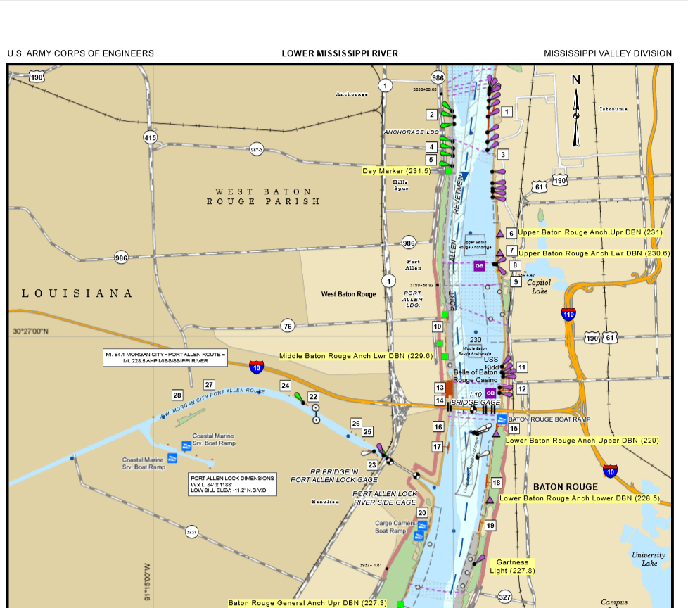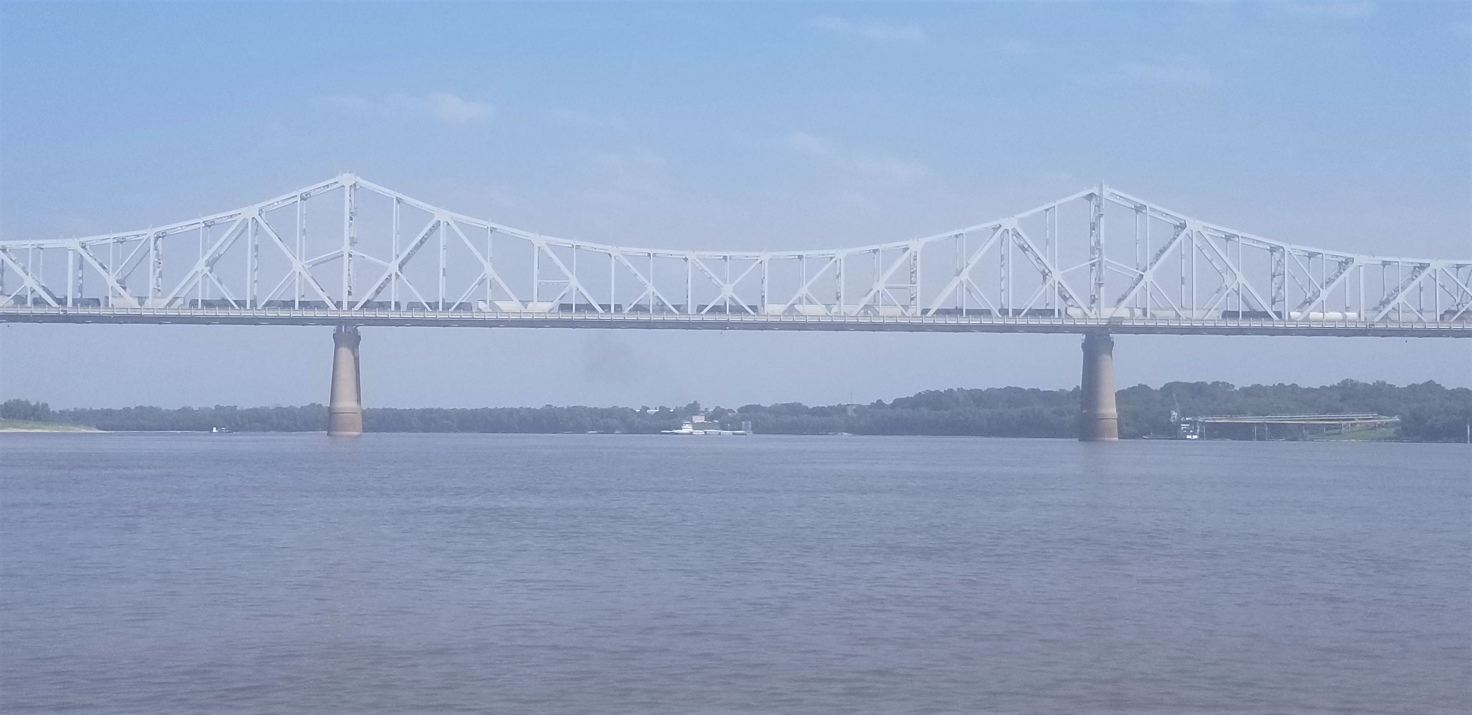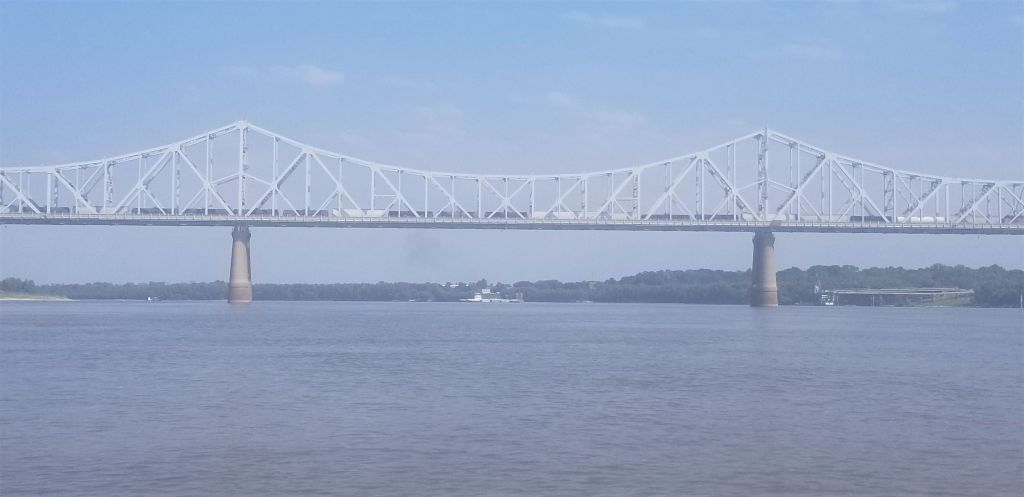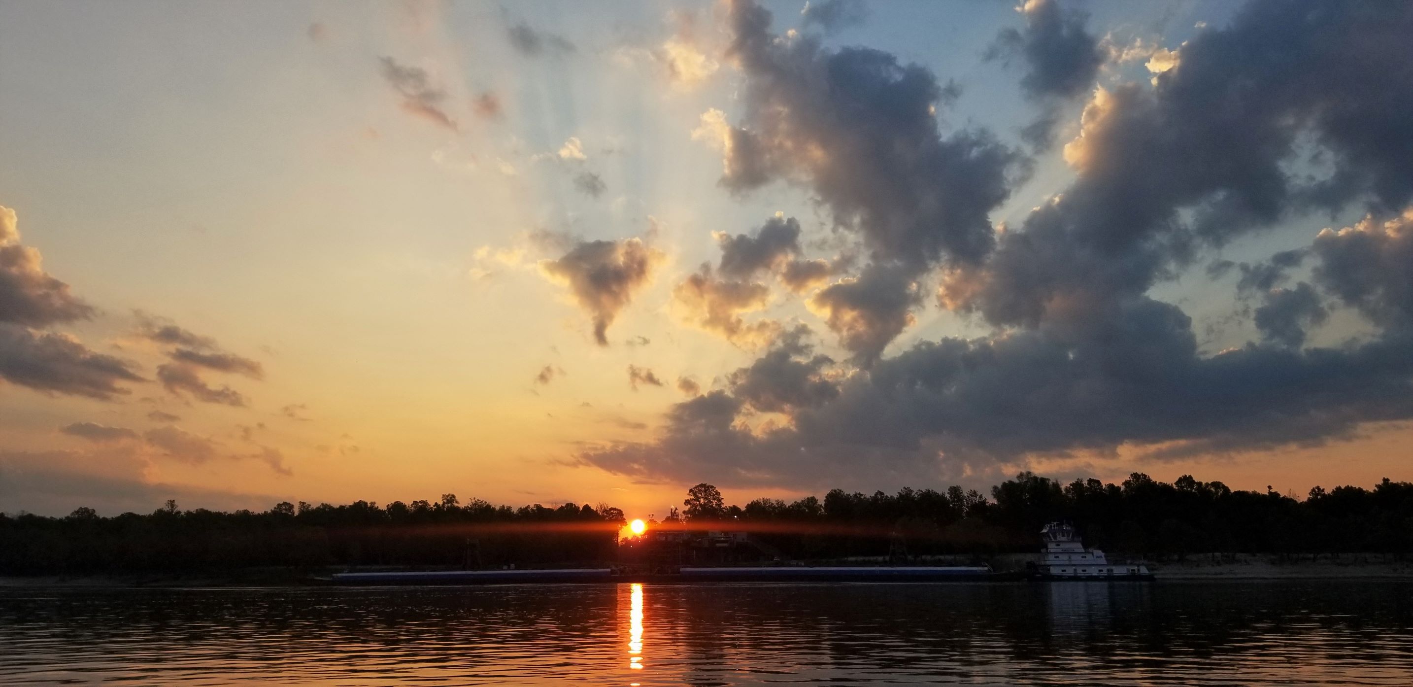 Passing under a bridge I see Baton Rouge on the other side of the river. I have to get over there now but a barge is coming up river. I stop and wait to cross 75 yards in front of a barge anchored in the river. A deckhand comes walking the length of the barge to the bow and says without shouting, “Could you move over to the side.” I quickly move over not realizing they were getting ready to move. Yikes! Over the barge’s loudspeaker I hear, “Attention rower! Are you the only one?” I look up at the bridge and nod and give a thumbs up. “I thought I saw two of you.” I give some kind awkward large hand gestures like moving my arm away from my body and holding one arm up and pointing to my chest. I guess he understood for he fired up and took off up river as soon as the channel cleared. I followed crossing just astern of him and found myself next to an ocean going cargo ship from Hong Kong. I kept my head on a swivel looking for anything that might be moving. I pulled up behind the USS Kidd an old Navy ship now a museum.