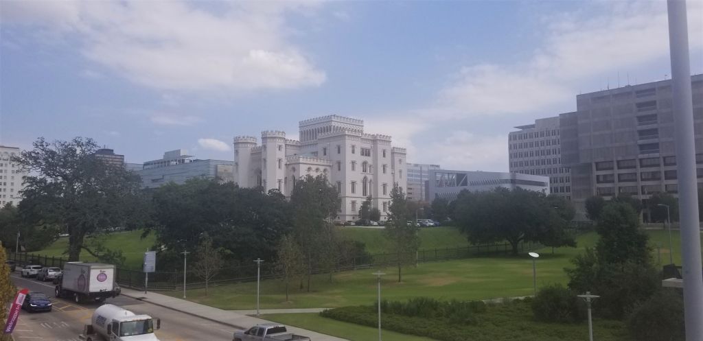 Well I’m not staying here tonight. I can still get sandwiches though. I walk a half mile into town to a subway. The air conditioning is bracingly cold as I stand in a long line soaked in sweat and filthy clothes. There are a couple of uniformed officers with guns and many of the other men are clean cut, wearing tight fitting polo shirts and khakis. They are all carrying guns. I’m sure Louisiana has friendly gun laws but. Turns out I am right next to a Louisiana District courthouse. Baton Rouge is also the state capital. Most people ignored me as I ate and relaxed in the AC but I have to wonder if some saw me and thought , Yeah we’ll see him a little later.