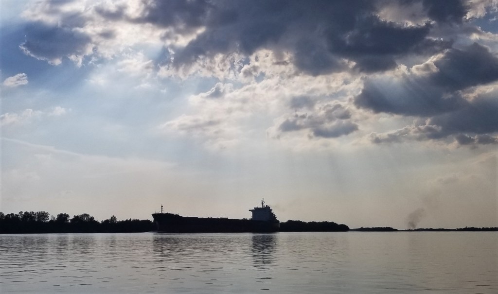 Maybe it is safe to stay here? No. I set back out and the next five miles was me swerving around anything moving and waving my hat to let captains know I was down there. Down river some, I saw it coming from miles away. An ocean going ship headed my way. I gave it plenty of room as it passed and set up to face the wake it left. It came in big rolling waves maybe ten of them and Little Joy easily floated over each one.