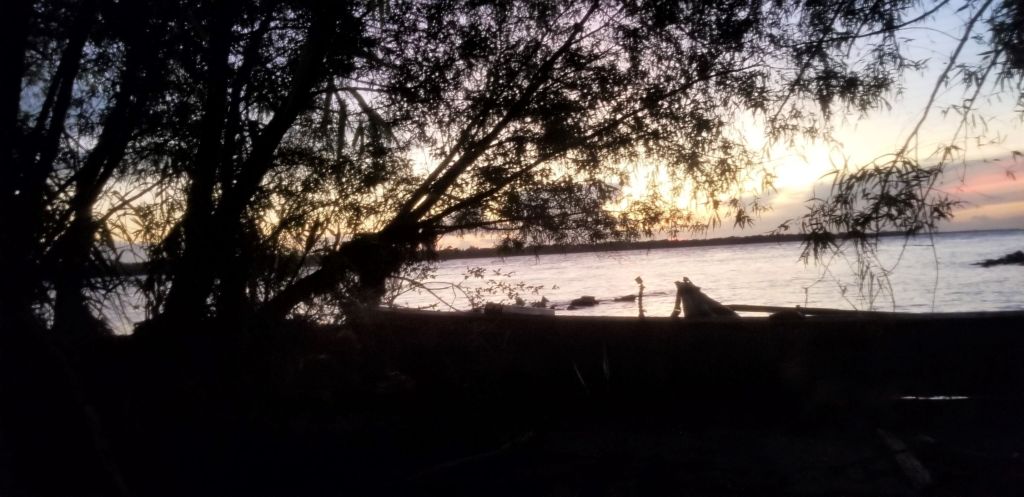 I awoke shortly after I fell asleep to crashing waves near the tent. I notice the water level is up. A Tide? Yep, the tide was coming up. A ship coming past compounded it with big waves. I sleep with one eye open now.