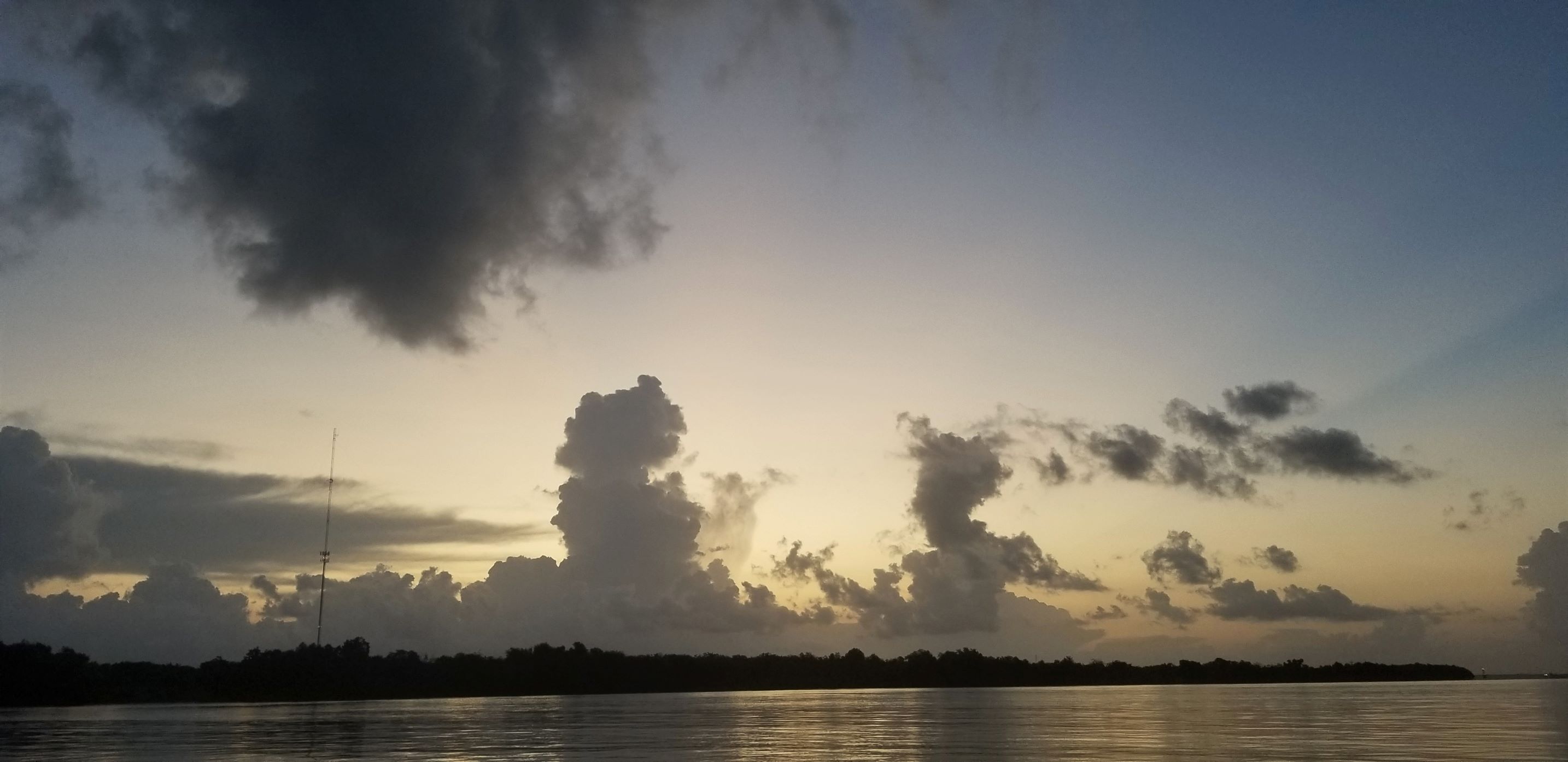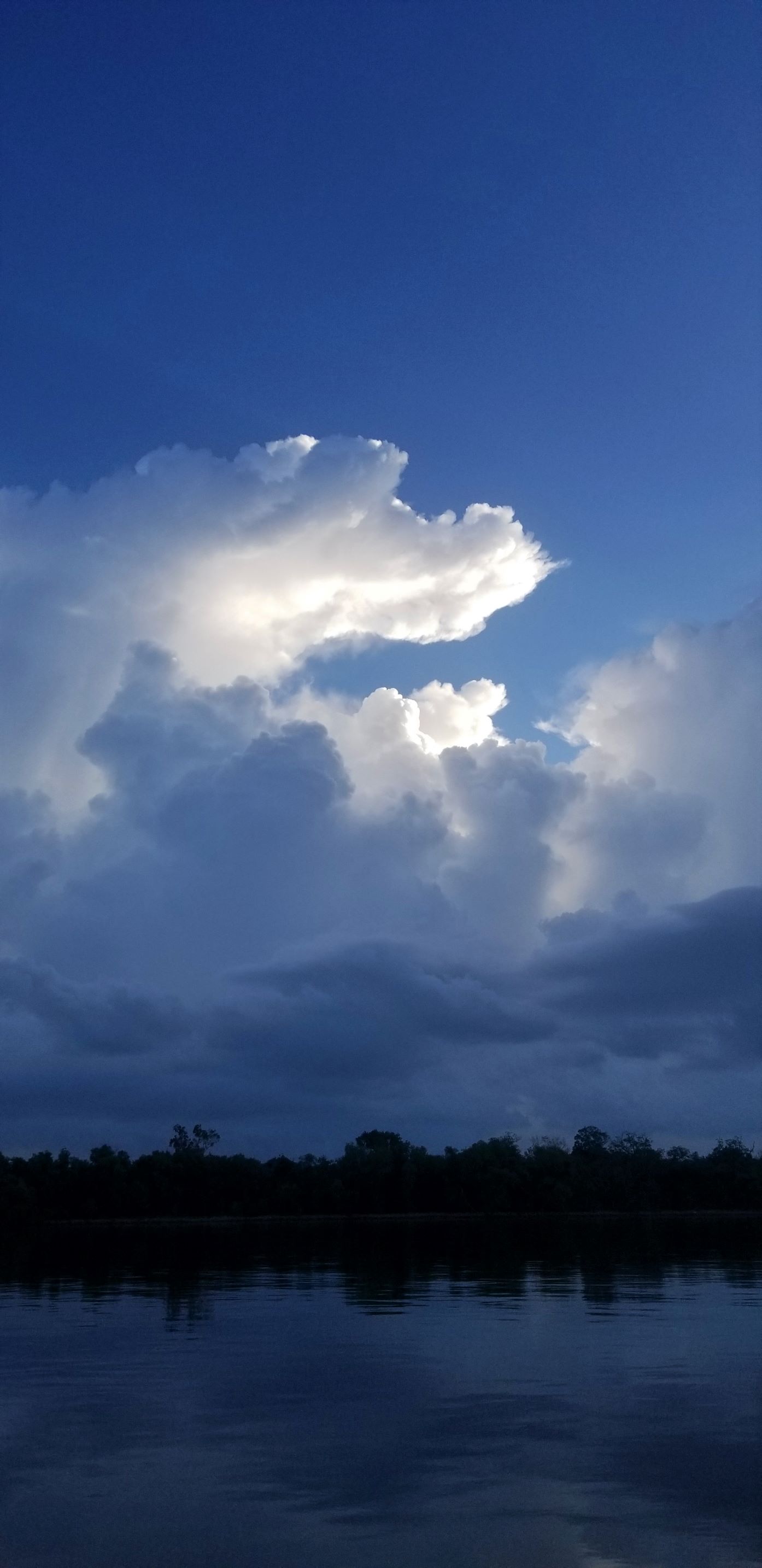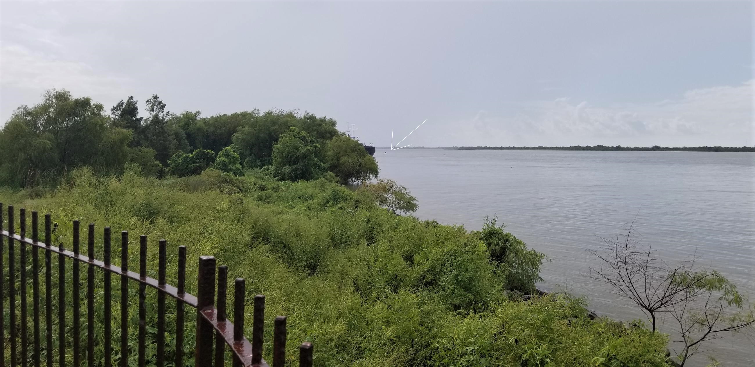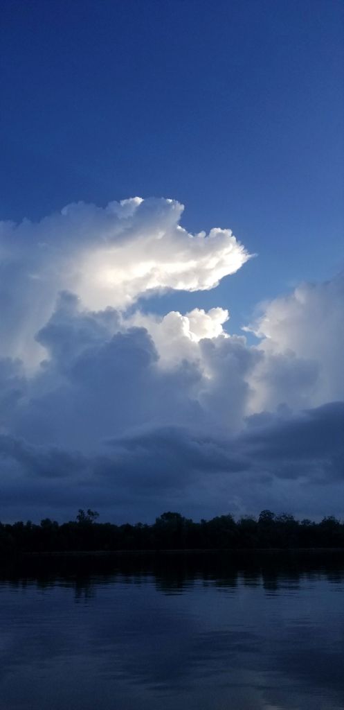 The sky was big now. An ocean sky. The storm came from the East. I don’t know why, maybe a Gulf thing, but I saw flashes in the dark, blue gray wall coming at me. I stayed right next to the bank on the east side taking refuge under small trees from the driving rain and the frequent lightning.