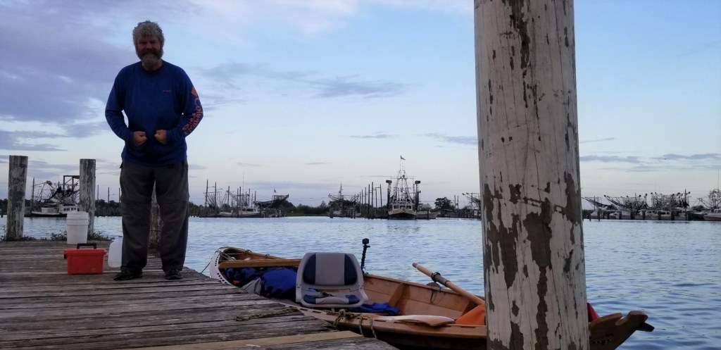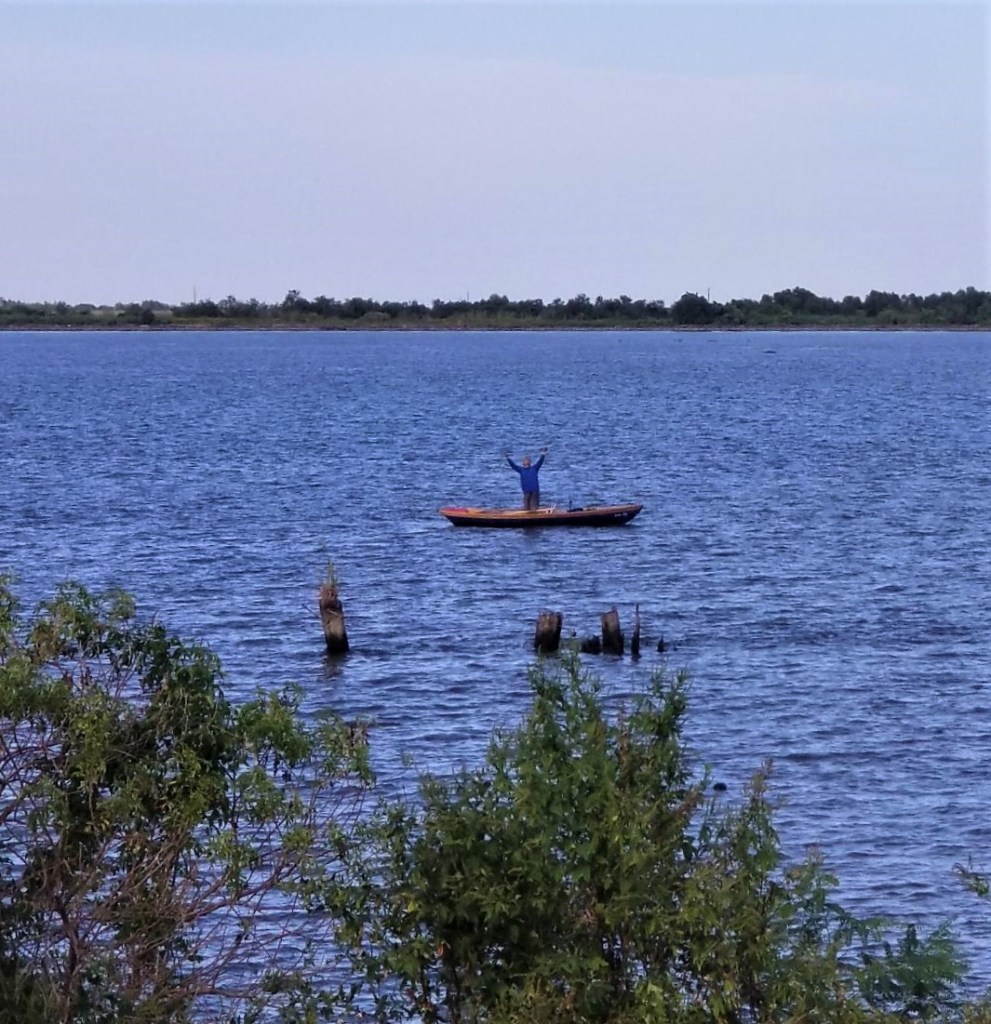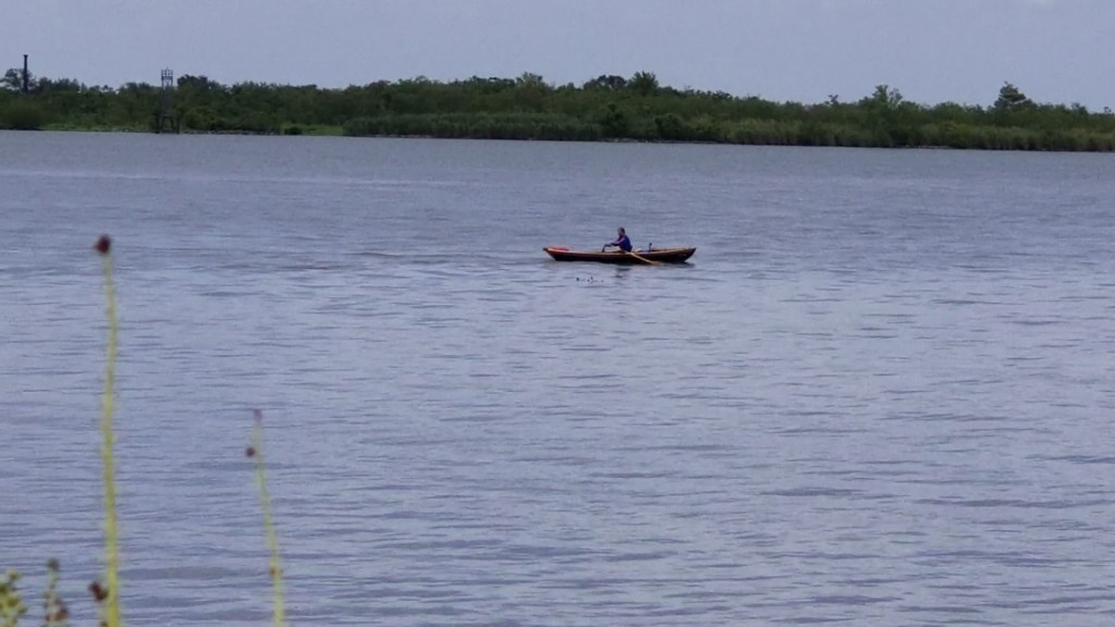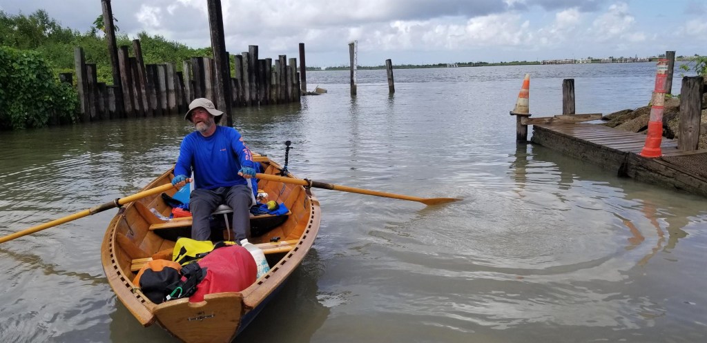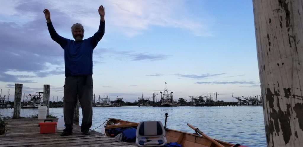 Patches of blue sky shone through as the storm passed. It was only 3 o’clock and I set out for the last 12 miles. Channel markers counted them down. 10 miles. The wind diminished. Actually it was now from the northeast and was helping me. 8 miles. I text Lijun and tell her meet me in Venice. 5 miles. I row hard, relentlessly, I do not stop. 3 miles. The joints and muscles of my hands are aching. I row hard. I do not stop. I see a couple of boats from the gulf now heading into the channel for Venice. It’s there. I row even harder now. I get there and … That’s it! I stop and breathe and then I hear yelling from the shore. Lijun is jumping up and down on top of the levee. I stand in the boat and face her raising my arms in victory. “Yeah!”